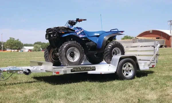 The Aluma 1026H-TA-BT-DT-RR-RTD trailer is an all-aluminum tandem axle trailer. Key features include a 1725 lb weight, 100″ x 26′ bed size, and 14″ tires. It comes with 3500 lb rubber torsion axles, electric brakes, a breakaway kit, aluminum wheels, extruded aluminum floor, bi-fold tailgate or aluminum ramps, retaining rails, LED lighting, stabilizer jacks, and recessed tie rings. The trailer has a 5-year warranty and optional upgrades such as heavier axles, rock guards, storage boxes, and hydraulic brakes.